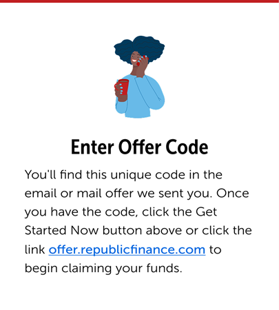 Great news! That means you’ve been pre-approved for a personal loan from Republic Finance. Visit the offer page and enter your offer code. You’ll be guided through a few simple steps to claim your loan funds!